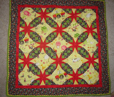 Just before my trip I finished the quilt I had been making for Baby B. It turn out pretty well for my first real foray into patchwork, first try at machine quilting, and considering how often (and how late into the game) I changed the design while making it.